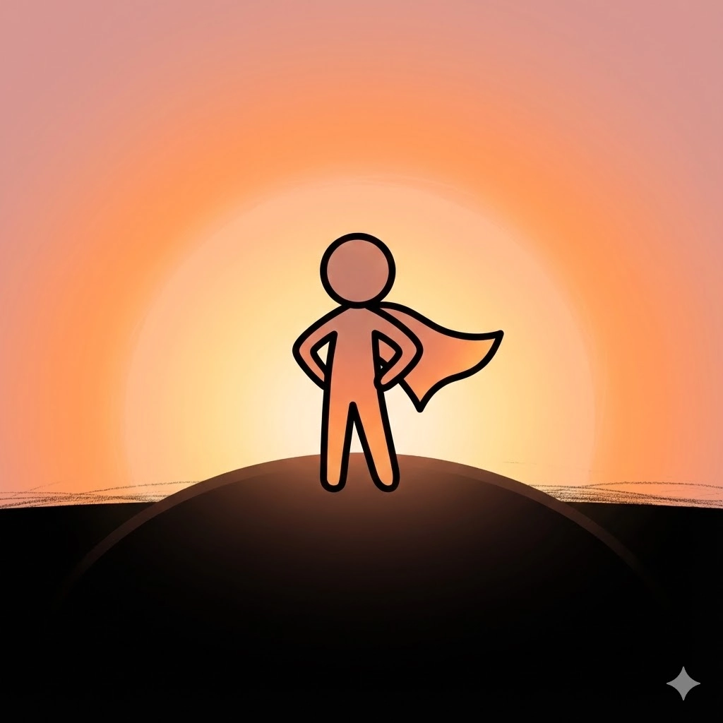 Prompt: “Stick figure standing on top of a hill, tiny cape flowing in the wind, heroic pose with hands on hips, large sunrise behind creating silhouette effect, bold thick outlines, dramatic but simple composition, soft gradient sky, faint texture in the horizon, slightly elevated viewpoint, inspirational feeling — aspect ratio: <AR> — no complex landscape, no extra characters, no realistic lighting effects, no heavy shading.”