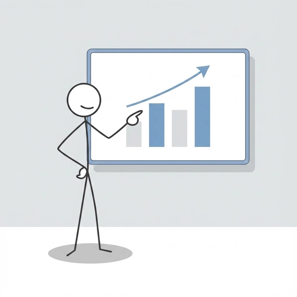 Prompt: “Stick figure drawing standing beside a whiteboard, hand pointing at a simple bar chart, confident stance, neat thin lines, modern flat illustration style, subtle shadow below feet, light gray office backdrop, plenty of white space for layout, calm blue accent color, organized and clean, visually instructional — aspect ratio: <AR> — no realistic humans, no tiny details, no paragraphs of text, no clutter.”