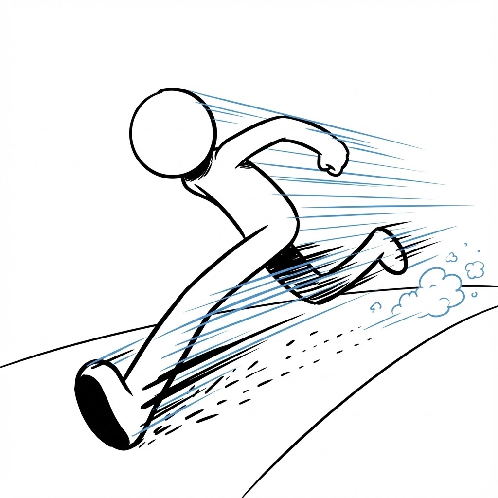 Prompt: “Stick figure sprinting forward at full speed, body leaning ahead, exaggerated long legs, motion streaks trailing behind, subtle dust trail at feet, dynamic camera angle slightly low, graphic comic style, crisp black lines, minimal color accents (blue speed lines), clear visual rhythm, strong sense of direction, simple track hint — aspect ratio: <AR> — no extra characters, no background scenery, no shading, no photorealism.”