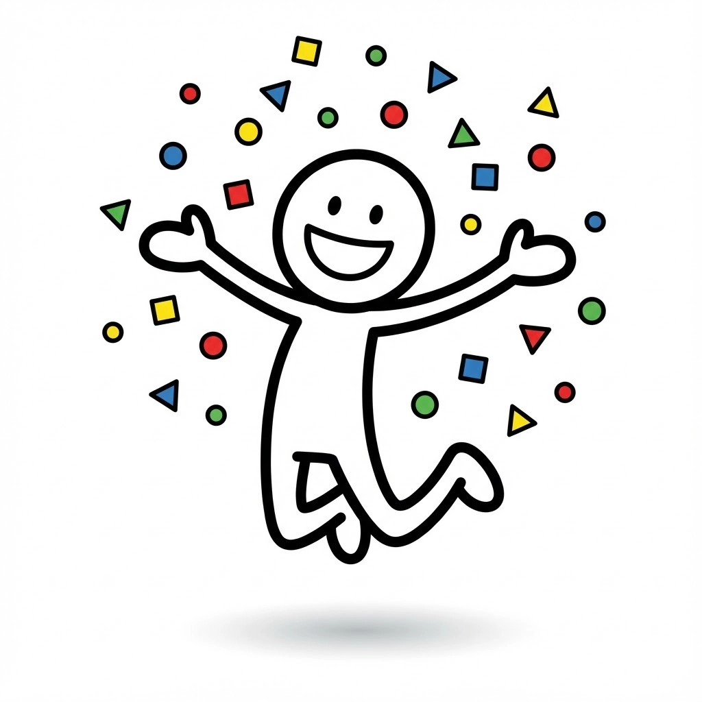 Prompt: “Simple stick figure drawing jumping high, knees bent, arms wide, big smiling face, confetti raining around, upbeat party mood, smooth bold outlines, slightly thicker lines for the body, clean white background, balanced negative space, centered framing, playful cartoon style, high-resolution vector look, soft drop shadow beneath feet — aspect ratio: <AR> — no text, no logos, no realistic anatomy, no cluttered details.”