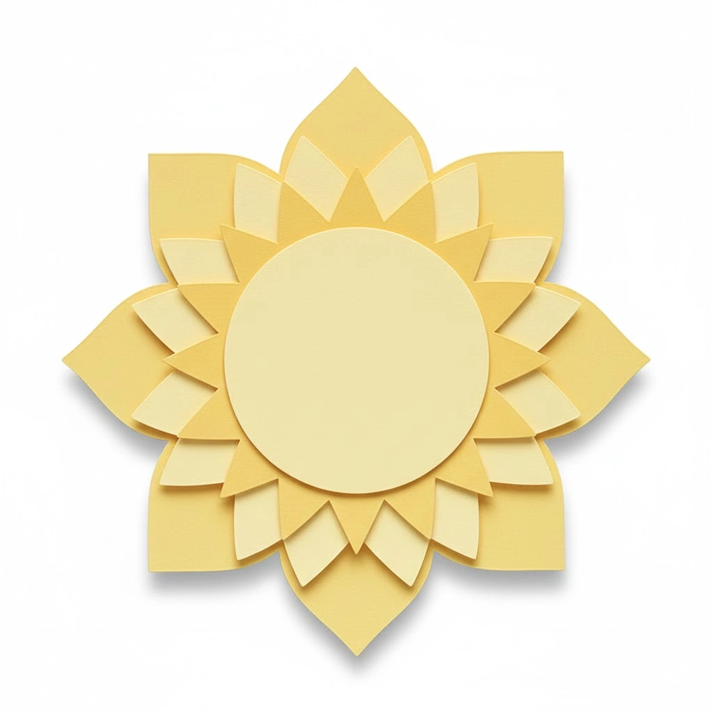 Prompt: “Paper-cut sun clipart, layered paper shapes forming a circular sun and rays, visible paper edges, soft pastel yellows, slight cut-paper depth effect, handcrafted craft style, transparent background — aspect ratio: <AR>